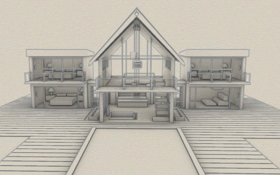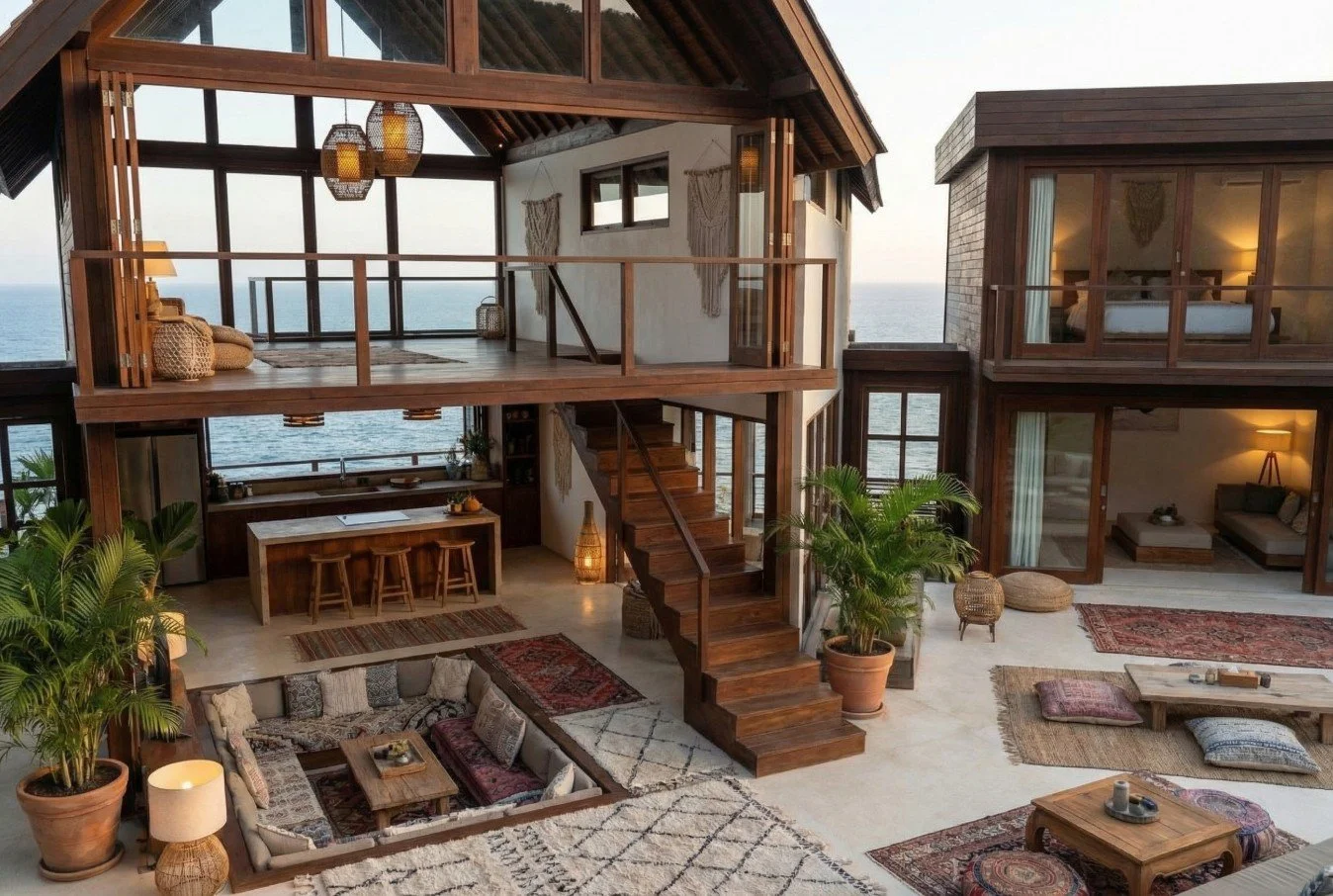 The brief was to create a visualisation of a South East Asian inspired residence set within the Mediterranean, positioned to take full advantage of its expansive sea views. The design aims to capture a calm, relaxed atmosphere through the use of natural timber, open planned living spaces, and laid back, bohemian inspired interiors, blending tropical influence with the light and landscape of its coastal setting.