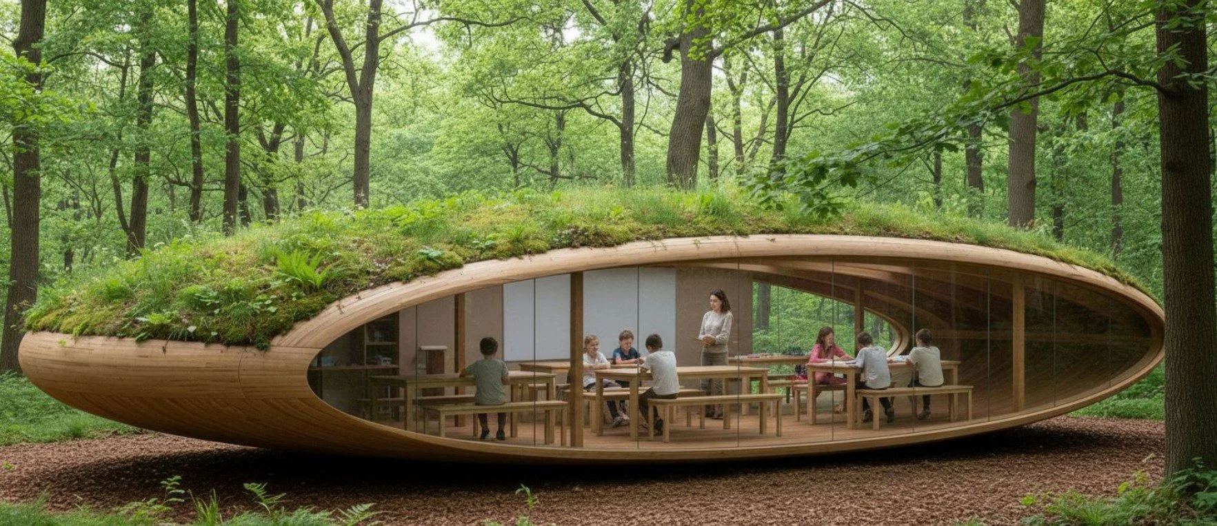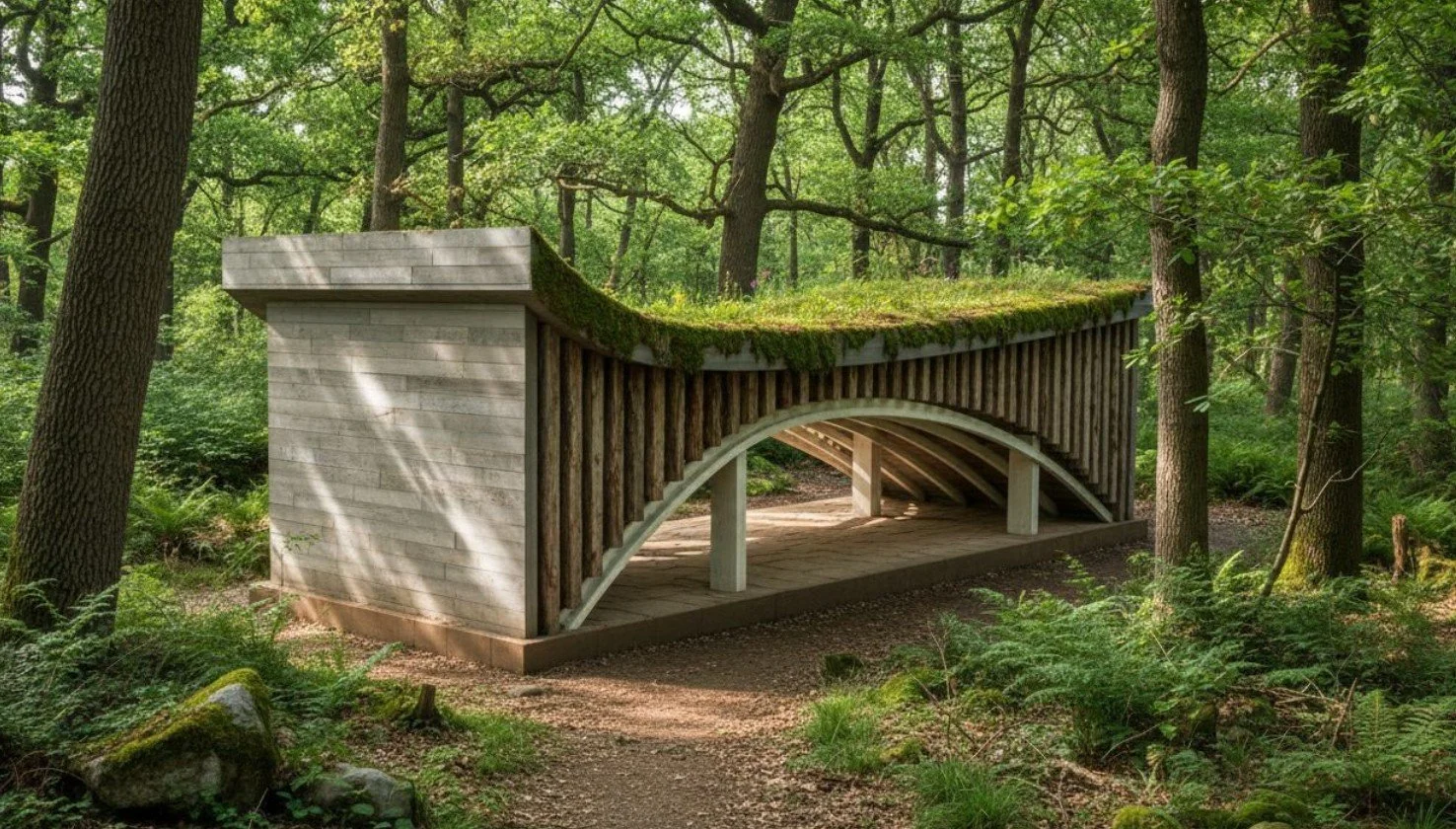A finished outdoor learning shelter set within natural woodland, designed with sustainability and context in mind. The architecture responds sensitively to its environment, creating a considered space for learning immersed in nature.