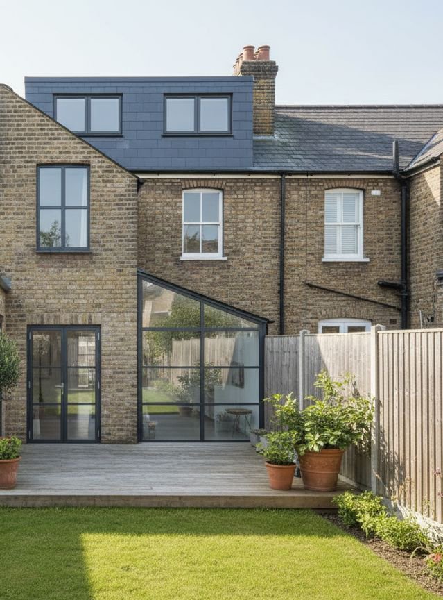 A contemporary glass-side and second-storey extension, adding a third bedroom while seamlessly connecting the home to its maintained garden.